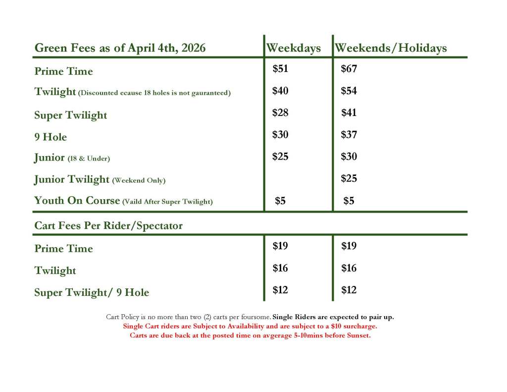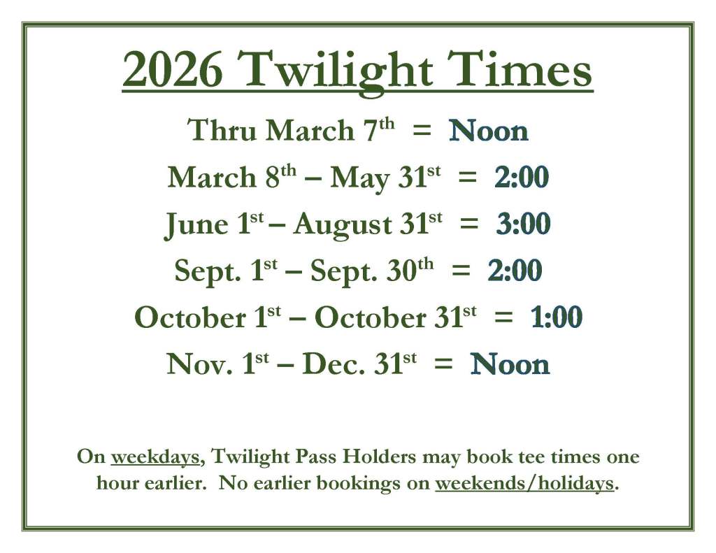 Twilight Fees are discounted because 18 holes are not guaranteed. See below for our Twilight hours throughout the year.